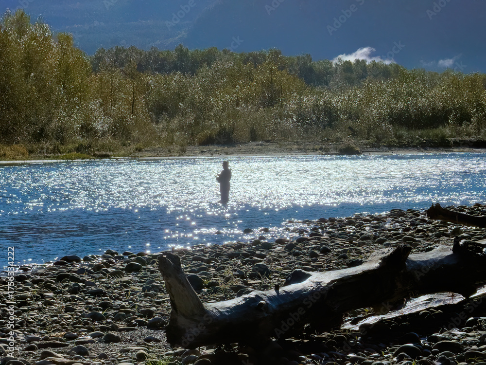 Close up Silhouette of fisherman fishing the Skagit river during a bright golden morning sunrise in the Autumn season with Cascade mountains in the background of Washington state