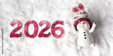 Christmas card of snowman, numbers 2026 and white snow. Merry Christmas and New Year 2026 greeting card