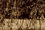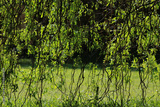 Long cascading willow branches with fresh green leaves hang down like a natural curtain over bright grass