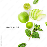 Green apple, lime and fresh mint composition isolated on white background. Modern minimalist design