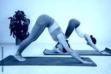 Women engage in a yoga practice, performing different poses to improve flexibility, strength, and mindfulness. This healthy activity promotes physical and mental well-being while encouraging a