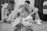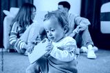 A curious toddler engaged in playful exploration with a bright yellow smartphone as family members enjoy quality time together in a cozy atmosphere, sharing laughter and joy in their interactions.