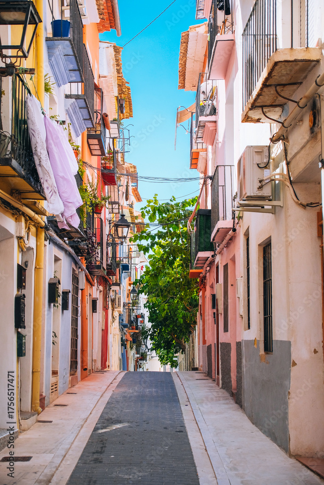 Villajoyosa street with typical colorful houses. La Vila Joiosa city, Alicante Province, Valencian Community, Spain