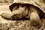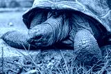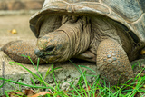 Giant land turtle with brown-grey shell and textured skin resting on the border between concrete and natural grass