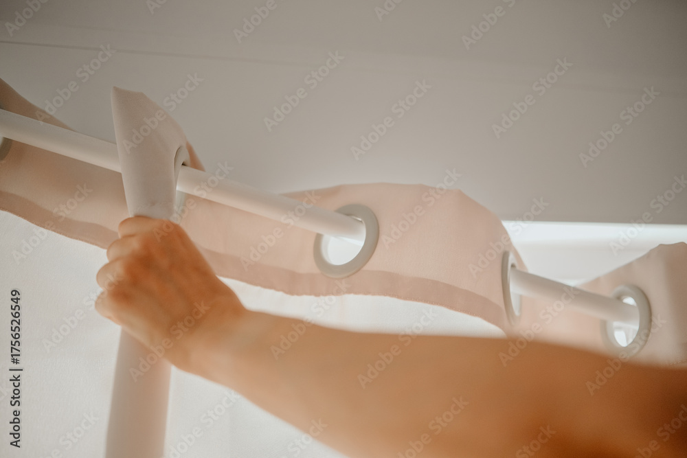 Woman Hands Taking Down Curtains for Cleaning, Home Care and Housekeeping Concept
