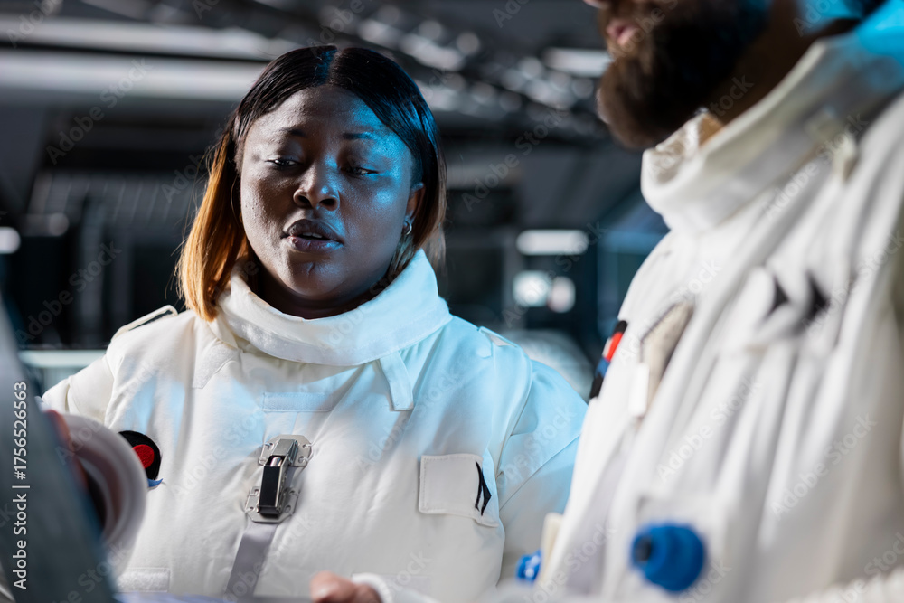 Female astronaut scientist and colleague in spacecraft conducting scientific experiments in orbit. Woman researcher wearing cosmonaut gear and coworker carrying out research aboard spacecraft