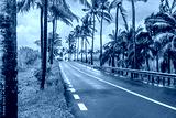 Tropical travel scenery: an empty, wet road flanked by green grass, yellow flowers, and tall, slender coconut palms