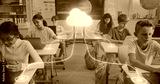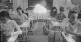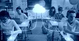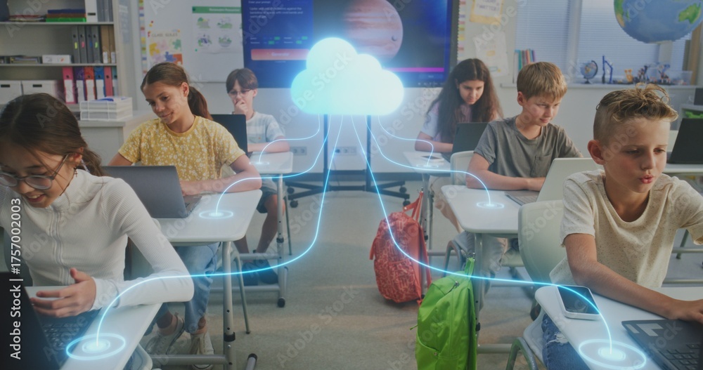 Kids Connected Cloud in Digital Classroom. Diverse Pupils Work on Laptops Connected to Cloud by Glowing Digital Lines. Cloud Technology, Networked Learning, Technology Education of Future. Dolly Shot.