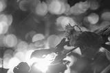 Close-up of green hazel leaves and an immature hazelnut growing on a branch, captured with soft natural light filtering through the foliage. The background features a beautiful bokeh.