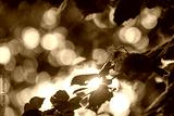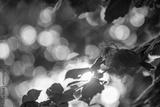 Close-up of green hazel leaves and an immature hazelnut growing on a branch, captured with soft natural light filtering through the foliage. The background features a beautiful bokeh.