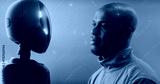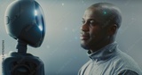 Man and Robot Companion in Near Future Tech Environment. Adult man AI robot looking each other, suggesting moment of collaborative check in. Concept future proof technology and advanced assistance.