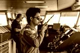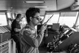 A male officer in a bright yellow and blue safety uniform is on the navigational bridge of a merchant ship, speaking into a handheld radio.