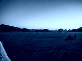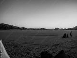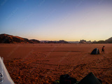 Desert landscape of the Red Tadrart with rock formations and golden sand under a blue sky. Natural scenery of the Algerian Sahara.