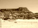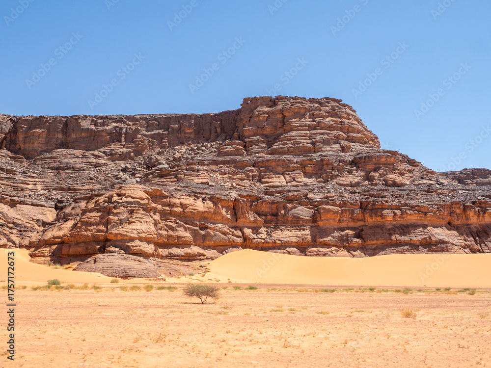 Rock formations and golden dunes of the Red Tadrart in the Sahara Desert. Stunning natural landscape under a clear sky.
