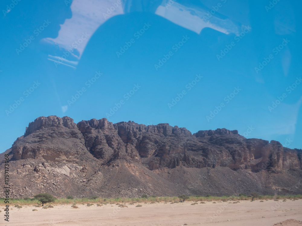 Rock formations and golden dunes of the Red Tadrart in the Sahara Desert. Stunning natural landscape under a clear sky.
