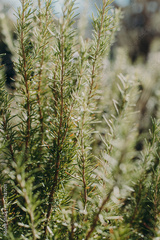 Fresh Sprigs of aromatic rosemary in the garden on a sunlight.