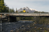 Person in Yellow Jacket Sitting on a Bridge Over a River with Snowy Mountain