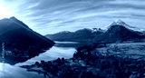 Majestic Panoramic View of Lake Huechulafquen and Snow-Capped Lanin Volcano with Dramatic Sun Rays. Patagonia, Argentina