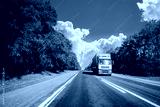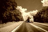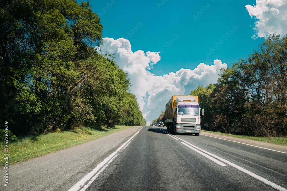 Truck On Country Road. Tractor Unit, Prime Mover, Traction Unit In Motion On Countryside Road In Europe. Business Transportation And Trucking Industry Concept