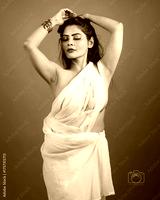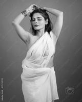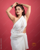 Editorial fashion portrait of a woman wrapped in flowing white fabric posing confidently against a rich red studio background. The minimalist styling emphasizes elegance, feminine grace