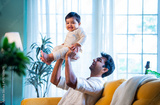 Indian Playful father and baby boy smiling while playing on living room sofa at home