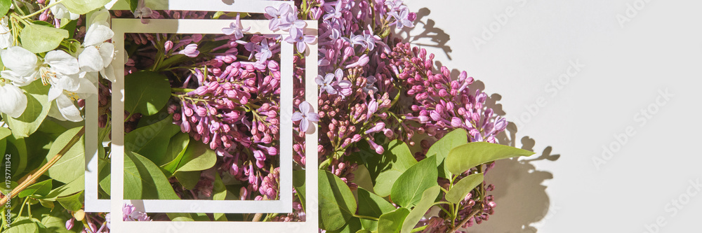 Vibrant purple and white lilac flowers with green leaves against a light background.