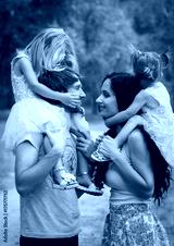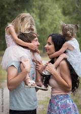Beautiful young family with two daughters walking in the forest in summer