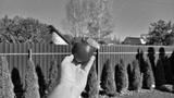 A man holds in his hand a ripe red apple with a green leaf on the stem. Nearby there is a grassy lawn, a metal profile fence and thuja trees. Sunny autumn weather, yellow leaves and blue sky