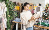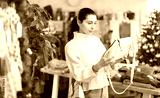 Armenian woman stands in a clothes store decorated for Christmas and chooses a handbag. Customer in the accessories department holds a stylish bag against the background of a Christmas tree