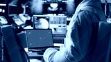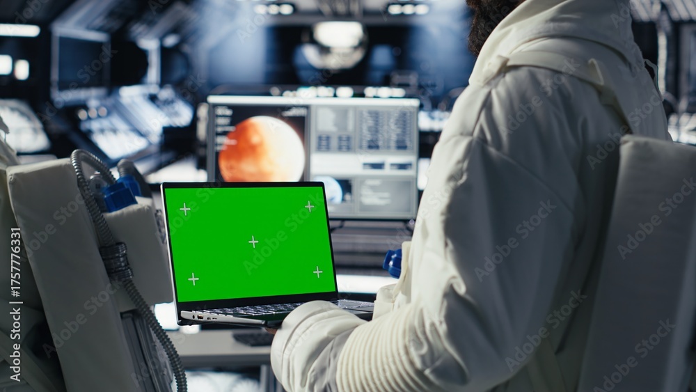 Astronauts reviewing onboard analytics on isolated screen laptop before stepping outside starship. Cosmonauts verifying parameters on chroma key notebook after landing on planet