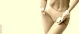 Beautiful young woman in panties with flower and syringe on light background with space for text, closeup. Female cosmetic genital surgery (fcgs) concept