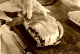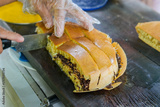 A vendor's gloved hand expertly slices a freshly made Martabak Manis (Indonesian sweet pancake). Chocolate sprinkles on one half and shredded cheese on the other. Bought at a street food vendor.
