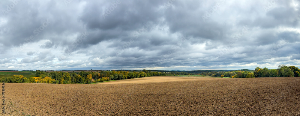 Panoramic view of rural landscape with field and autumn colored forest under cloudy sky
