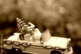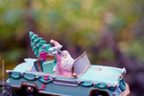 A toy car with Santa in close-up. Christmas tree toys.