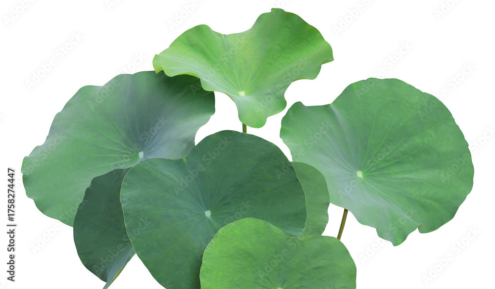 lush green lotus leaves display their natural beauty in a detailed photograph, isolated against a deep transparent background for design elements.