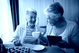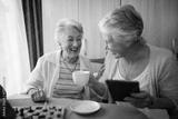Happy senior friends talking while having coffee