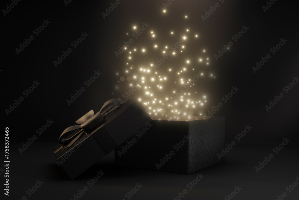 Black Friday giftbox surprise for shopping sale promo. Open gift box on black background with golden glitter spark. Unboxing present for holiday event. 3d render illustration