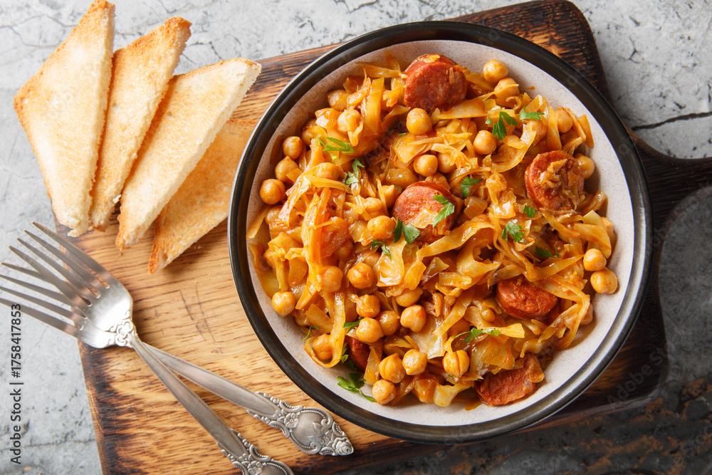 Spanish Cabbage and Chickpeas known as col con garbanzos with the addition of paprika and chorizo sausages on a plate on the table. Horizontal top view from above