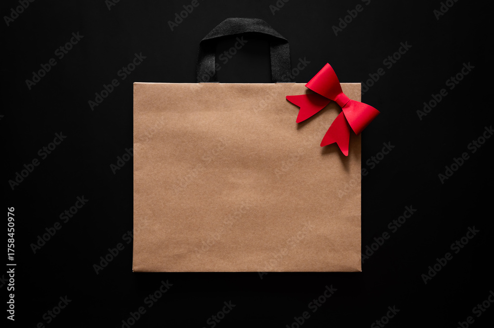 Black Friday concept with a brown paper bag with a red bow and black handles centered on a dark background.