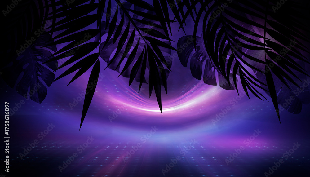 Silhouettes of tropical leaves empty scene background, abstract multicolored neon lights.