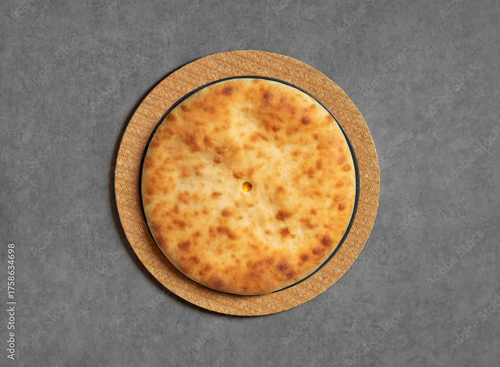Ossetian pie on a wooden napkin. Pumpkin pie on a gray background. Top view, flat lay.