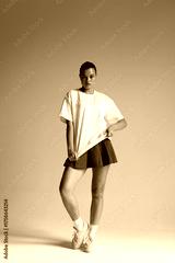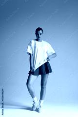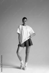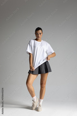 female model exudes assertive energy while casually posing in minimalist studio environment