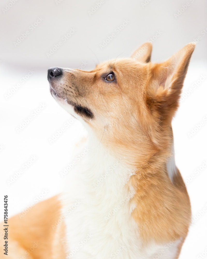 Adorable red and white Pembroke Welsh corgi puppy playing outside in the snow