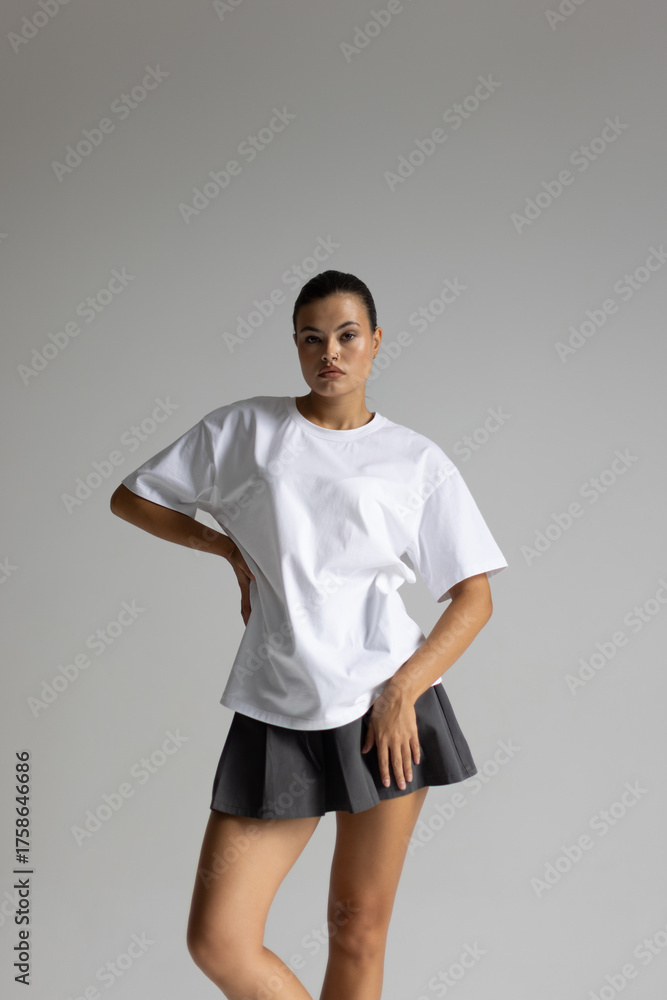 model promoting confidently, professional female model delivering promotional energy in casual