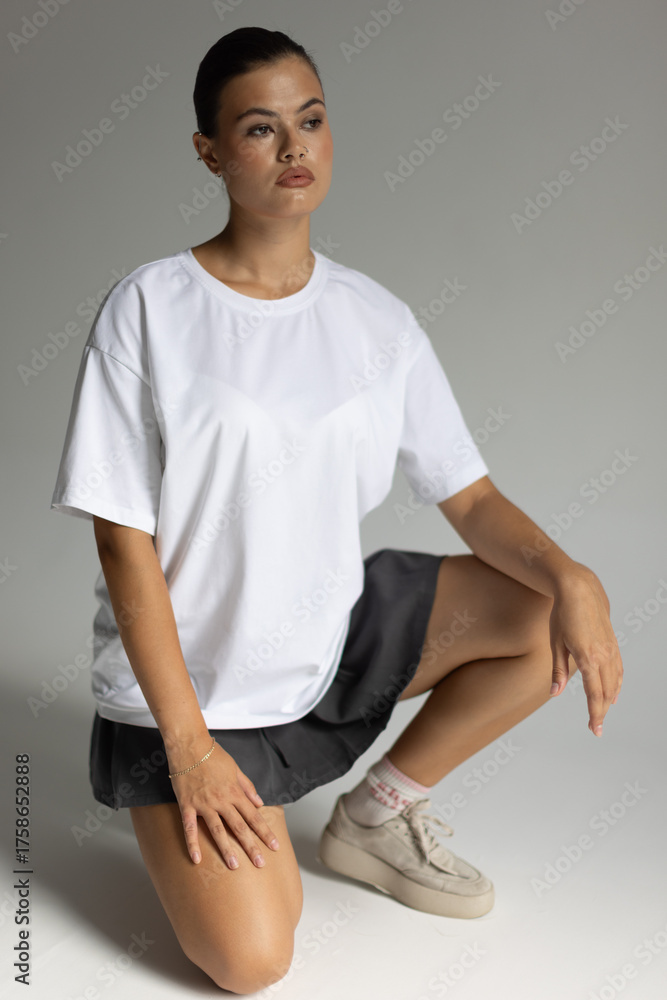 grounded female poses peacefully, studio female model demonstrating relaxed posture and tranquil