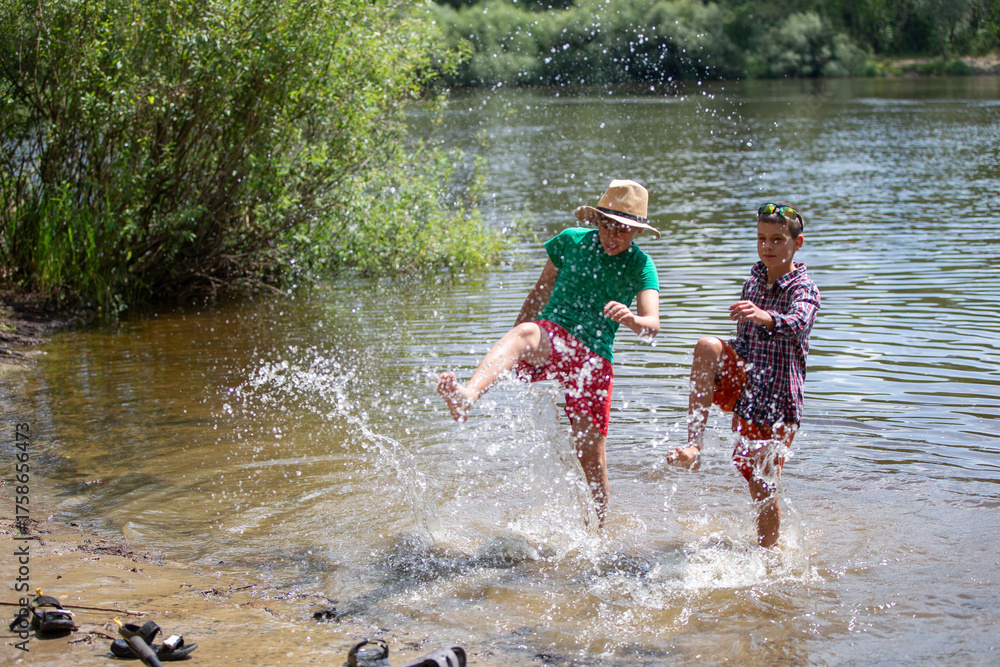 Two children splash water playfully at the river's edge during a sunny summer afternoon in a natural setting surrounded by greenery
