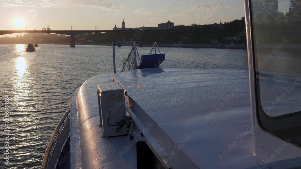 Bow of passenger ferry moving on river at sunset near city. Clip