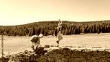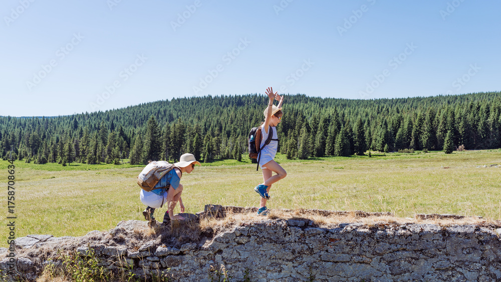 Mother and daughter hikers balancing on an old stone wall in sunny mountain meadow, playful family adventure and outdoor bonding with backpacks, forest landscape and blue sky in background