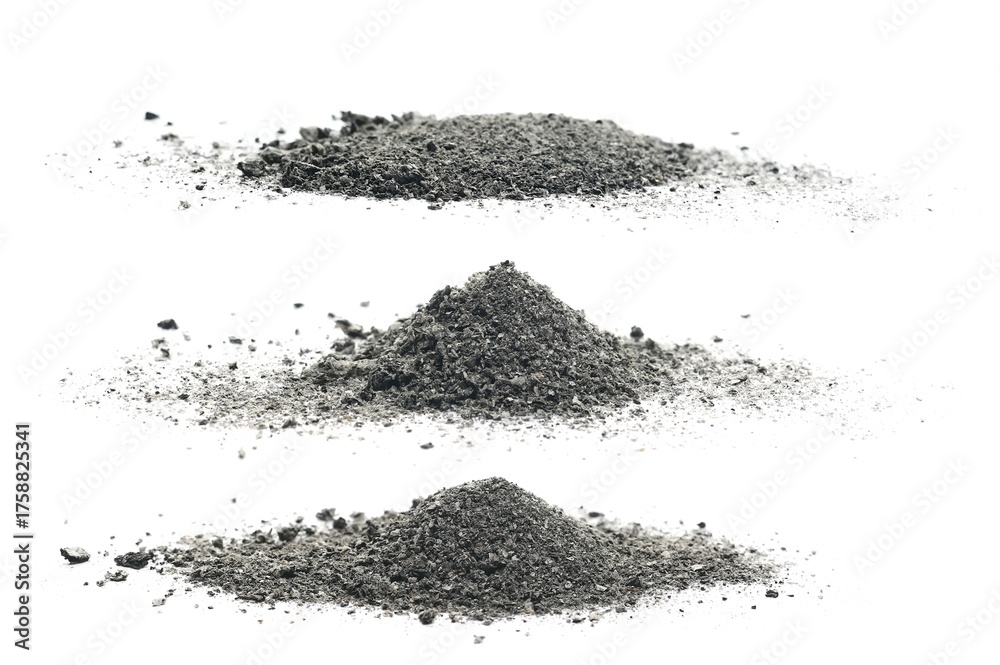 Set cigarette ash pile isolated on white background and texture, side view, clipping path