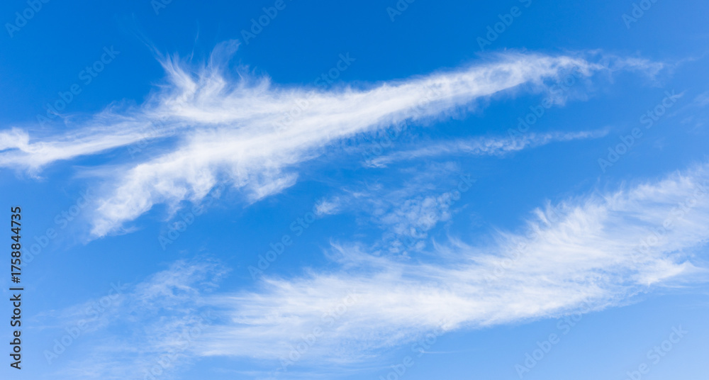 A bright blue sky backdrop with soft, white wispy clouds drifting across the frame